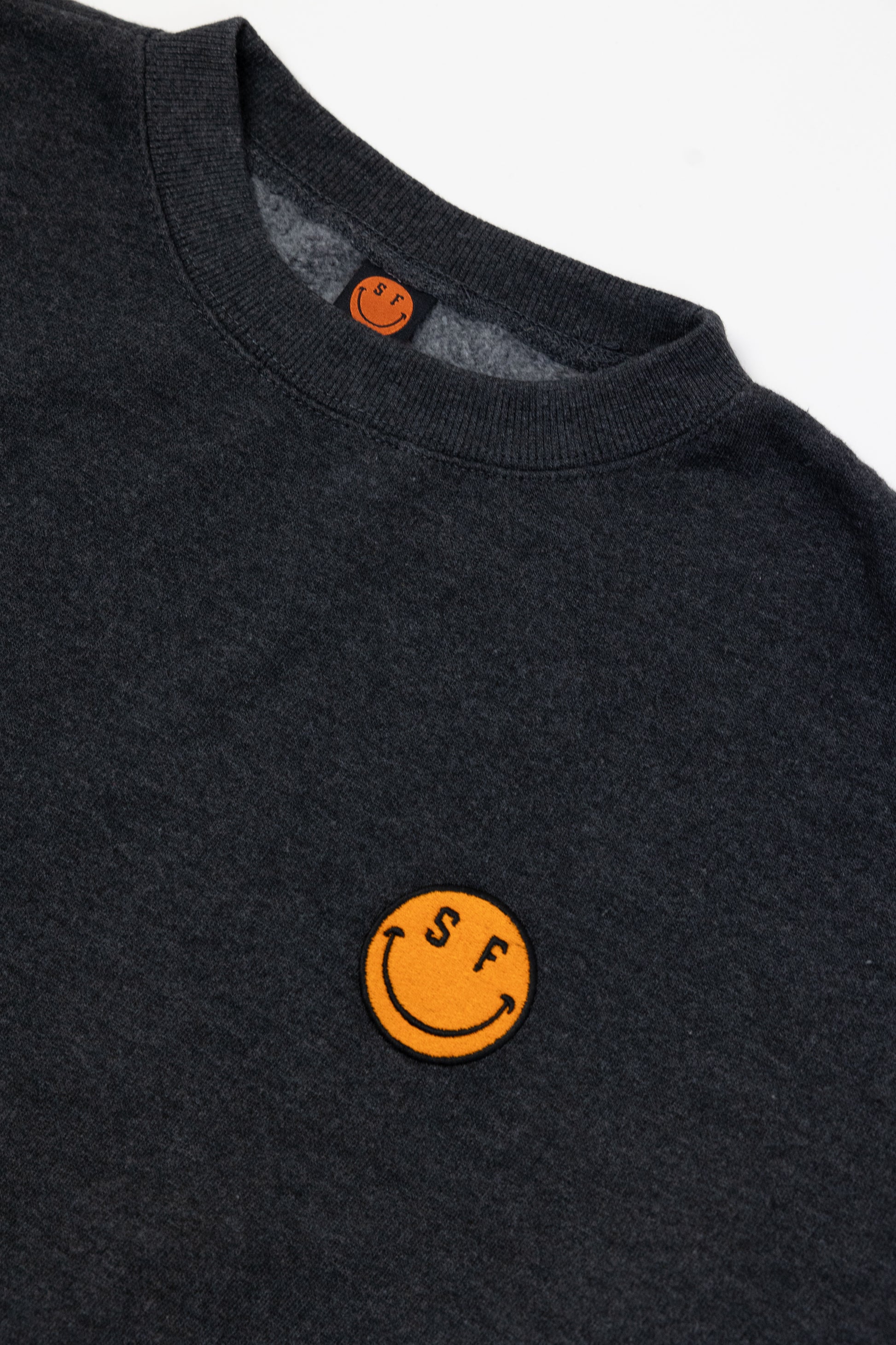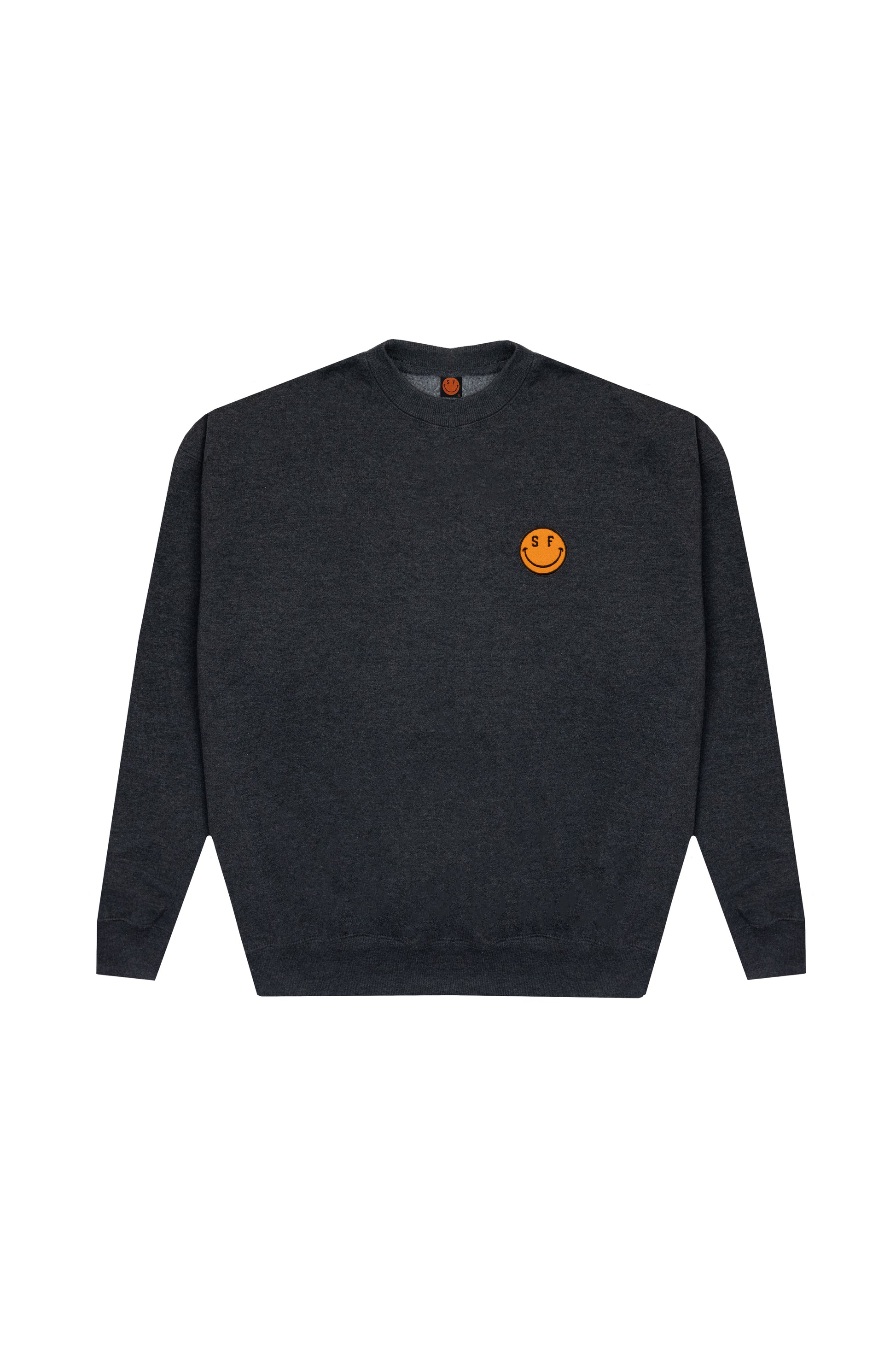 Our best selling crew, pre washed-size up, embroidered orange smile face on left breast